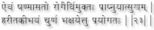 During the Hemanta season (November- December) powdered dry ginger powdered amvla (fruit of Phylonthus Emblica) and powdered Haritaki (Terminalia Chebula) should be mixed together and taken before drinking Shivambu. The Yogi who follows this practice becomes free from all diseases. All disorders resulting from abnormalities of body fluids are corrected. Sharpness of vision is improved felicitous speech and knowledge of all science is acquired without any effort. (102)