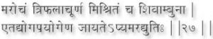 If powdered pepper and Triphala Choorna (mixed powder of Terminalia Belavica, Terminalia Chebula and Phylonthus Emblica) mixed with Shivambu are taken regularly, one acquires a radiance like that of the gods. (27)
