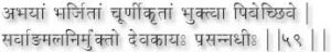 O Consort of Shiva ! One who drinks Shivambu after taking roasted and powdered Abhaya (Haritaki, Trminalia Chebula) succeeds in purifying his whole body, his body comes to resemble the bodies of gods, and he acquires a cheerful frame of mind. (59)