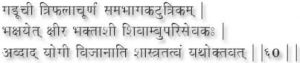 And he who sedulously drinks Shivambu after taking the mixture of equal part of the powders of Amrita, Triphala (see verse 27), Kau, dry ginger, cum in seeds and the roots of Piper Longum, and keeps to a diet of only and milk will within a year develop an understanding of the Scriptures. (60)