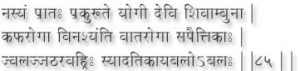 O Goddess, if the Yogi takes Nasya (cleans his nasal passages) with Shivambu every morning, he will be cured of all the three humors kapha (phlegm), Vaata (Air), and pitta (Bile) His appetite will be stimulated, and if his body is weak, it will be greatly strengthened. (85)