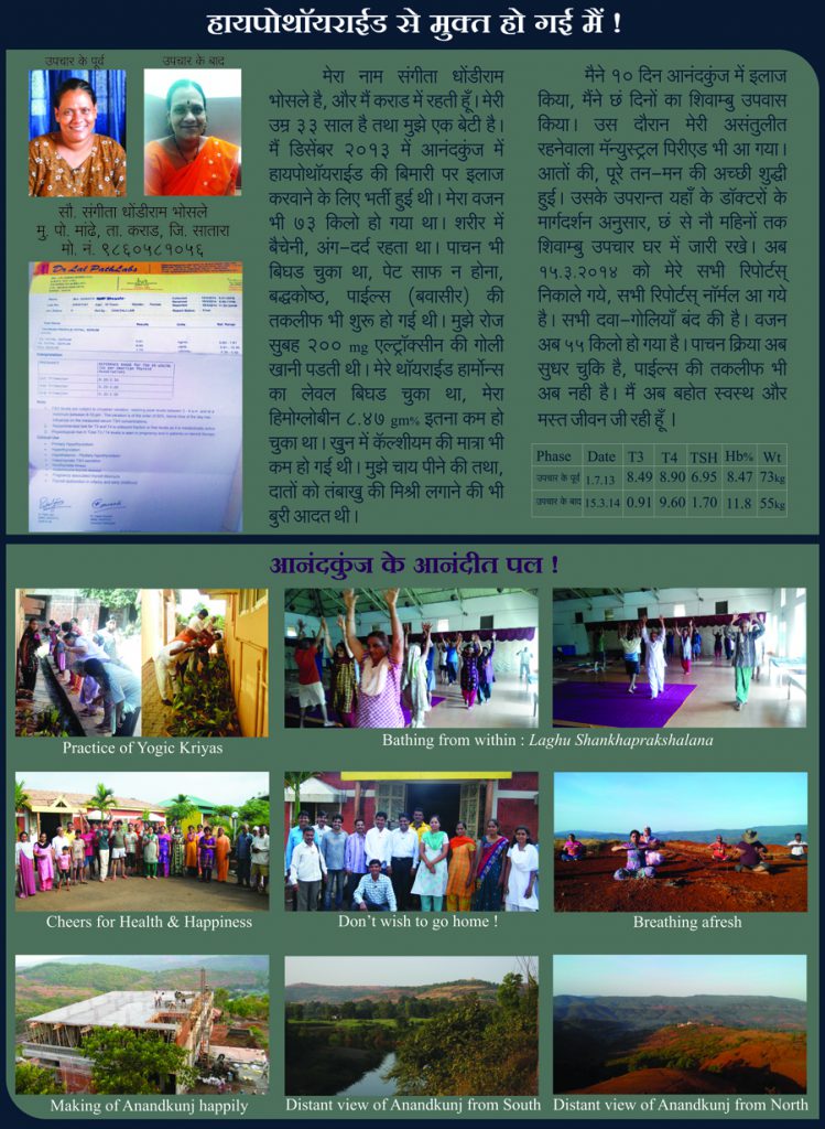 I am Mrs. Anjana Mahesh Bhalodia, a resident of Sangli, was suffering from severe blood mixed loose motions which gradually increased day by day. I was admitted to a very reputed hospital in Sangli, and after an endoscopy examination, I was diagnosed with ulcerative colitis. Fed up with the failure of all the medical systems and therapies there, I entered a unique Health Center in Kolhapur – Shivambu Bhavan – a revolutionary health center to combat all diseases. There, with regulated diet, naturopathic treatments and off-course Auto-urine therapy, I am now completely cured. My weight has increased from 24 Kg to 48 Kg.