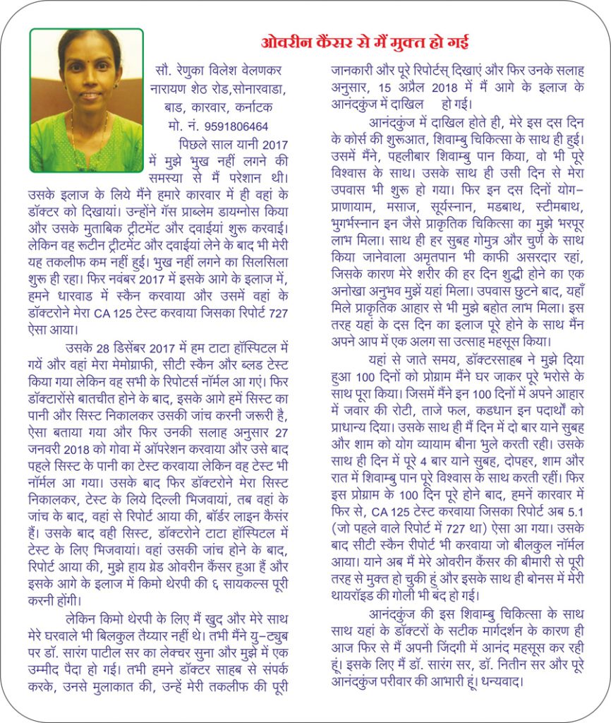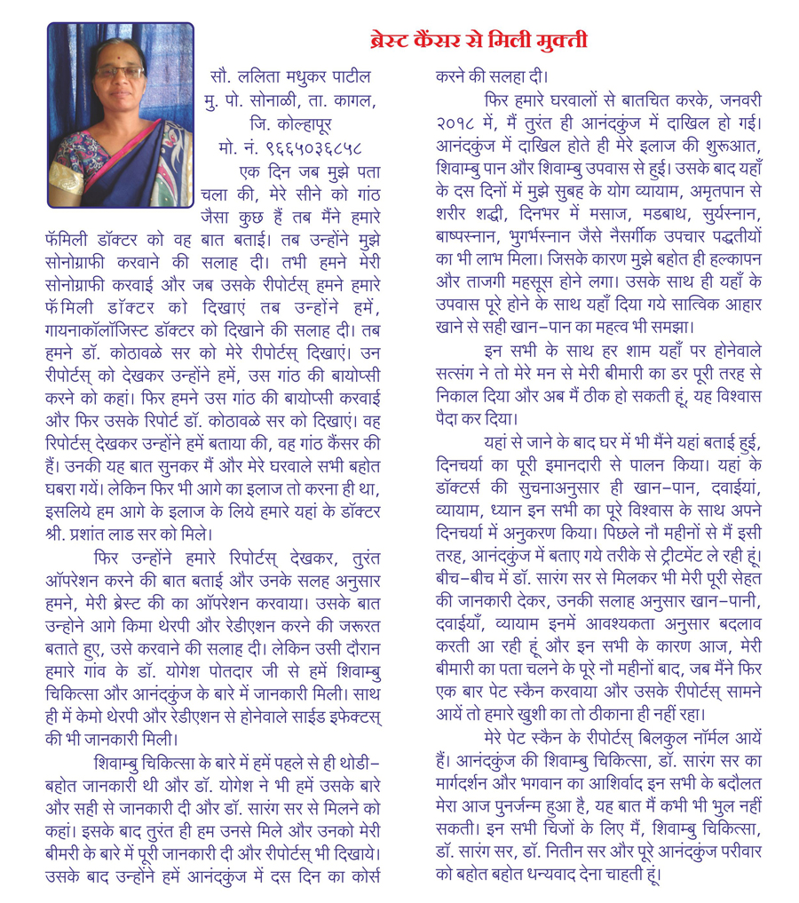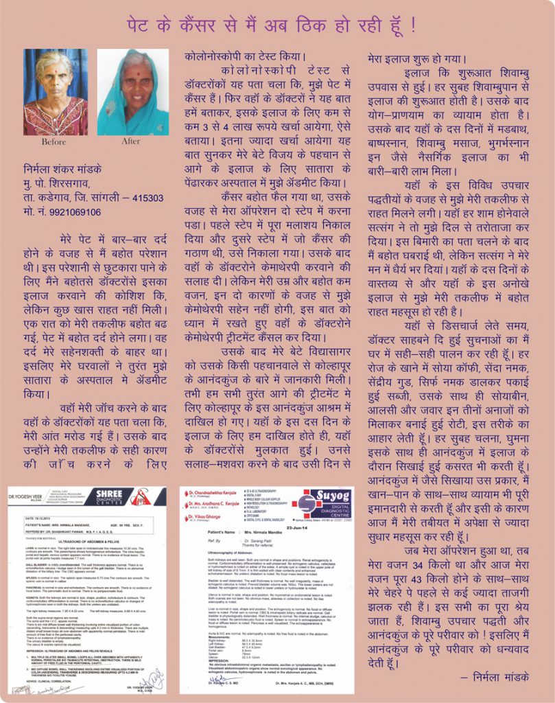 I am Mrs. Manisha Deshpande (name changed) from Sattra, was diagnosed of having breast cancer in 1988. Even after undergoing treatments from renowned hospitals like Tata Memorial my disease was not cured. After taking advice from one of my friends, I got admitted to this center. I received a lot of healing and mental support from this institution. The regimen of natural diet, yoga and other treatments given here is until-today helping me to lead a tension free healthier life.