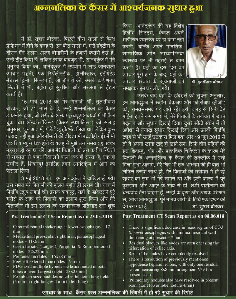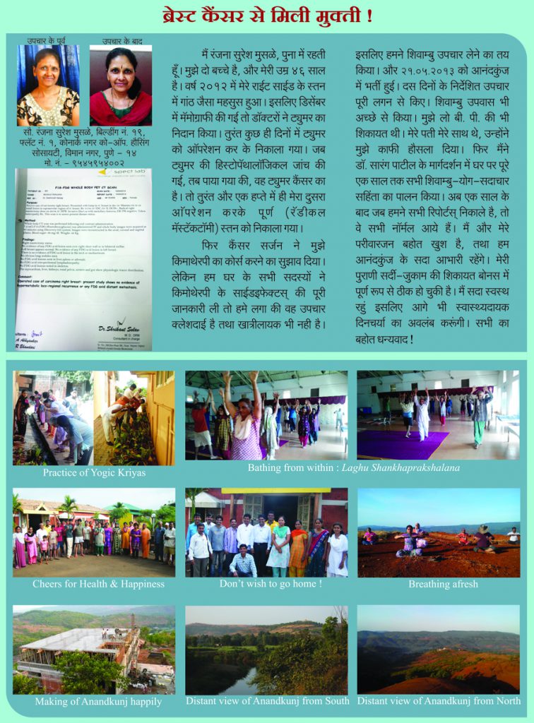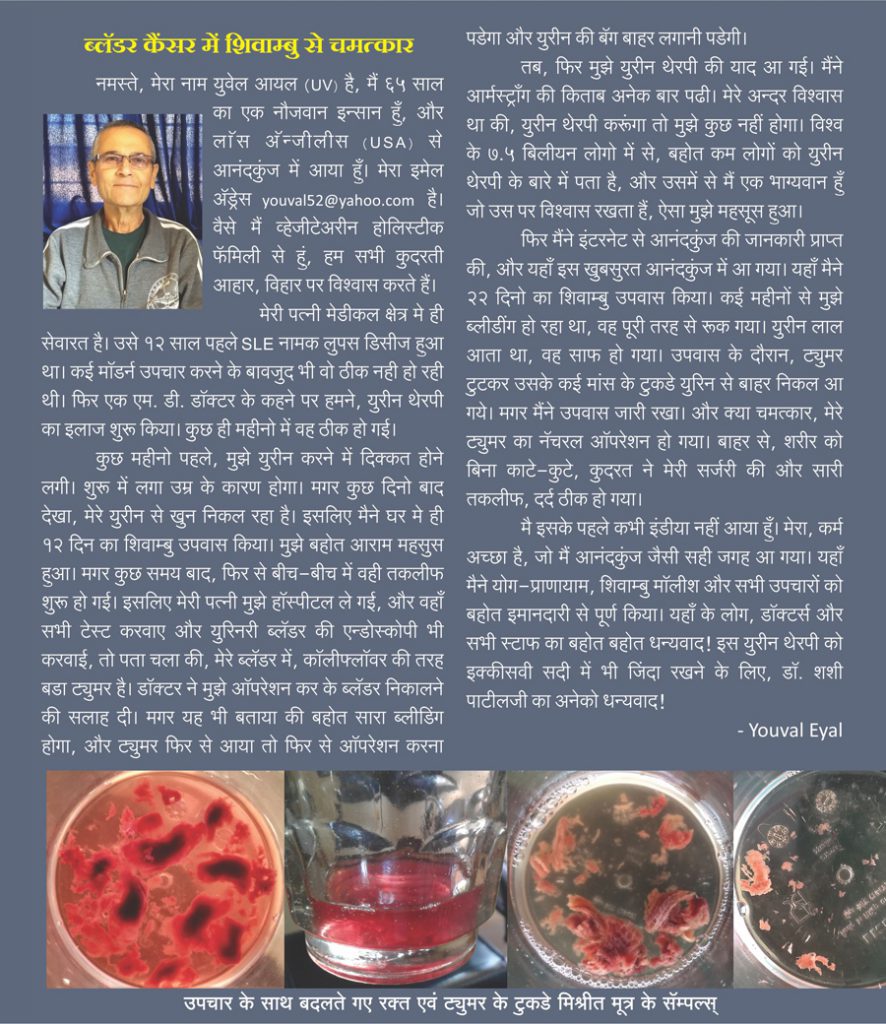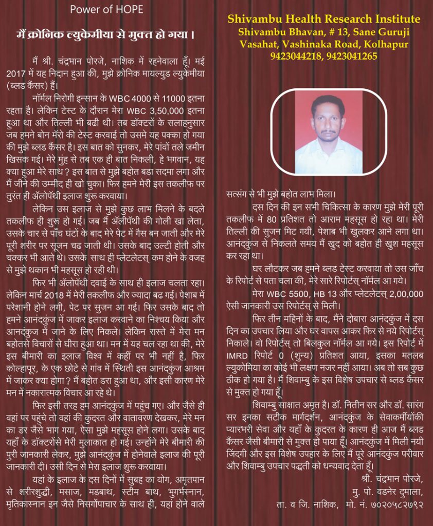 He recommends the Shivambu Center in Kolhapur which successfully treats cancer, diabetes, asthma, cardiac disorders, and helps patients heal from many other illnesses; as a new hope, a new life especially for the common people.Mr. Tukaram Kamble